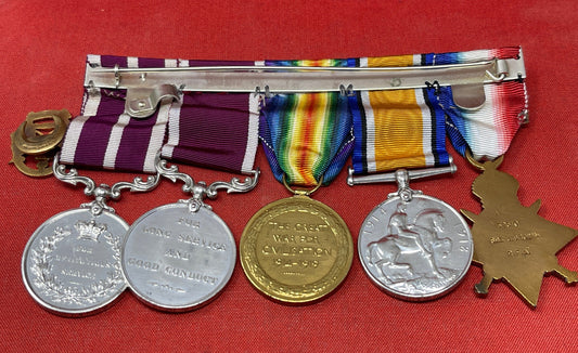 A First World War long and meritorious service medal group of five awarded to WO2 J Brown 29 Bde RFA.