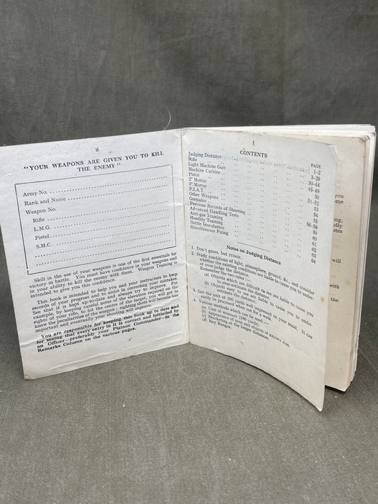 Original WW2 Soldiers Skill At Arms Record Book, rifle, LMG, Sten/Thompson, Grenades.