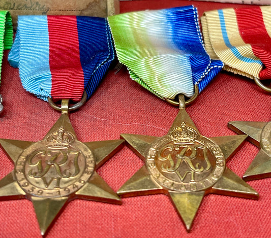 A WWII Medal Group Defence Medal, War Medal, Africa, France & Germany Stars and 1939-45 Star