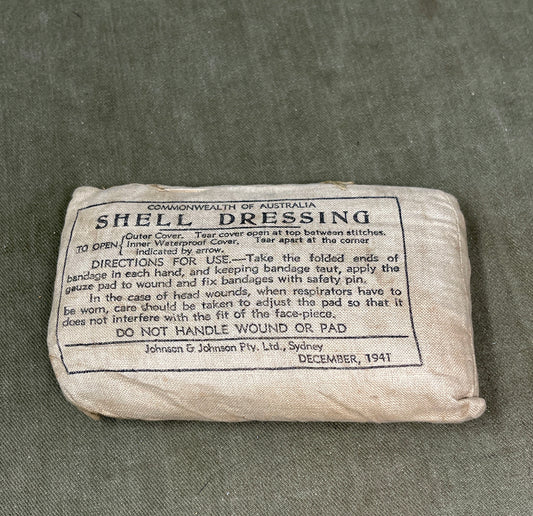 Each shell dressing consisted of a sterile gauze pad with an attached bandage, packaged in a sealed waterproof wrapper to protect it from dirt and moisture. The dressing was compact and easy to carry, typically stored in a soldier’s uniform pocket or first-aid kit for quick access during battle.