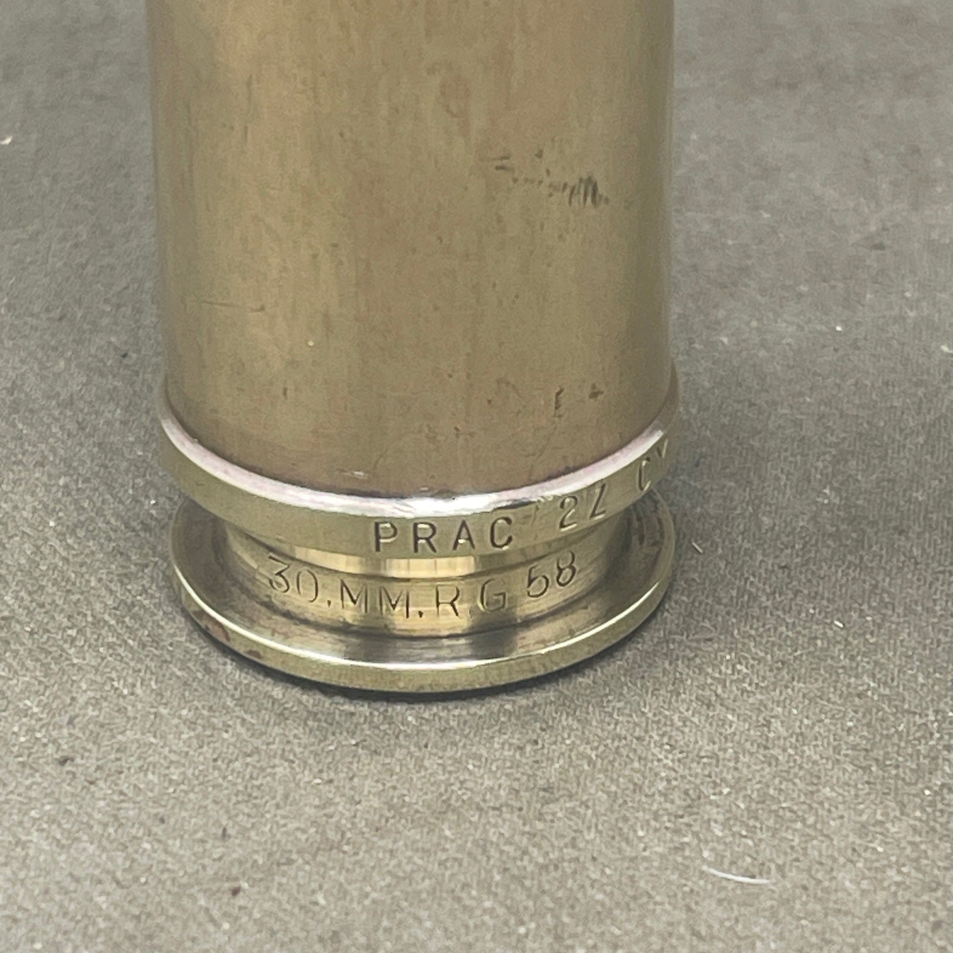 The 30mm RG 58 PRAC 27 CY 16 64 Projectile & Brass Cartridge Case is a training round designed for military applications. It consists of a 30mm projectile made from inert materials, ensuring safe handling and use during training exercises. The projectile is encased in a durable brass cartridge, known for its resistance to corrosion and ease of reloading. The projectile features a distinctive marking code "27 CY 16 64" indicating its specifications and manufacturing details. Designed to simulate live ammunition, this round provides realistic practice scenarios for operators without the risk of explosive detonation, enhancing combat readiness.