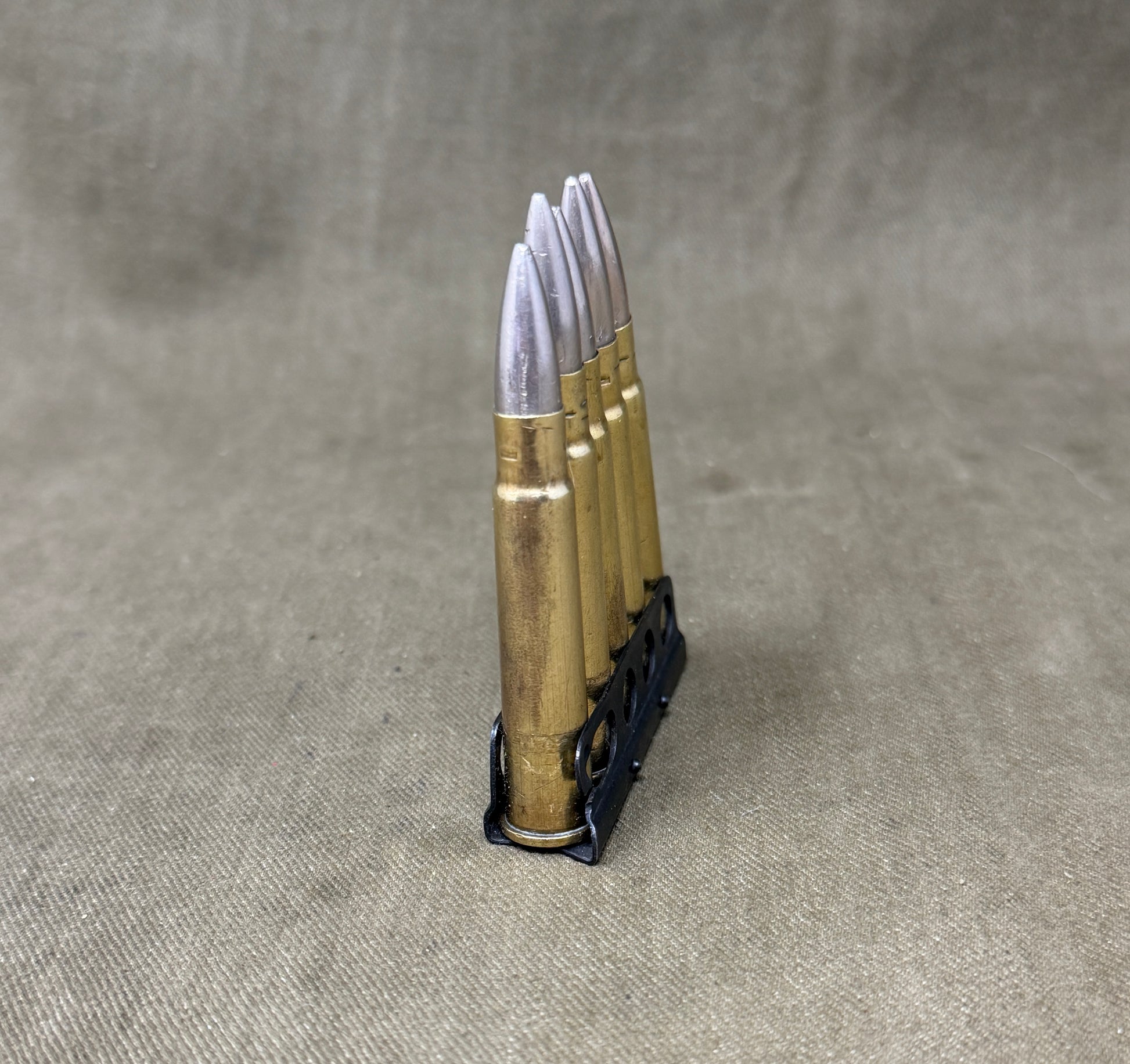The included original charger remains in excellent condition, retaining its correct form and finish, and complements the cartridges perfectly. Together, they represent a genuine example of British military issue small arms ammunition as used with the Lee-Enfield rifle during the conflict.