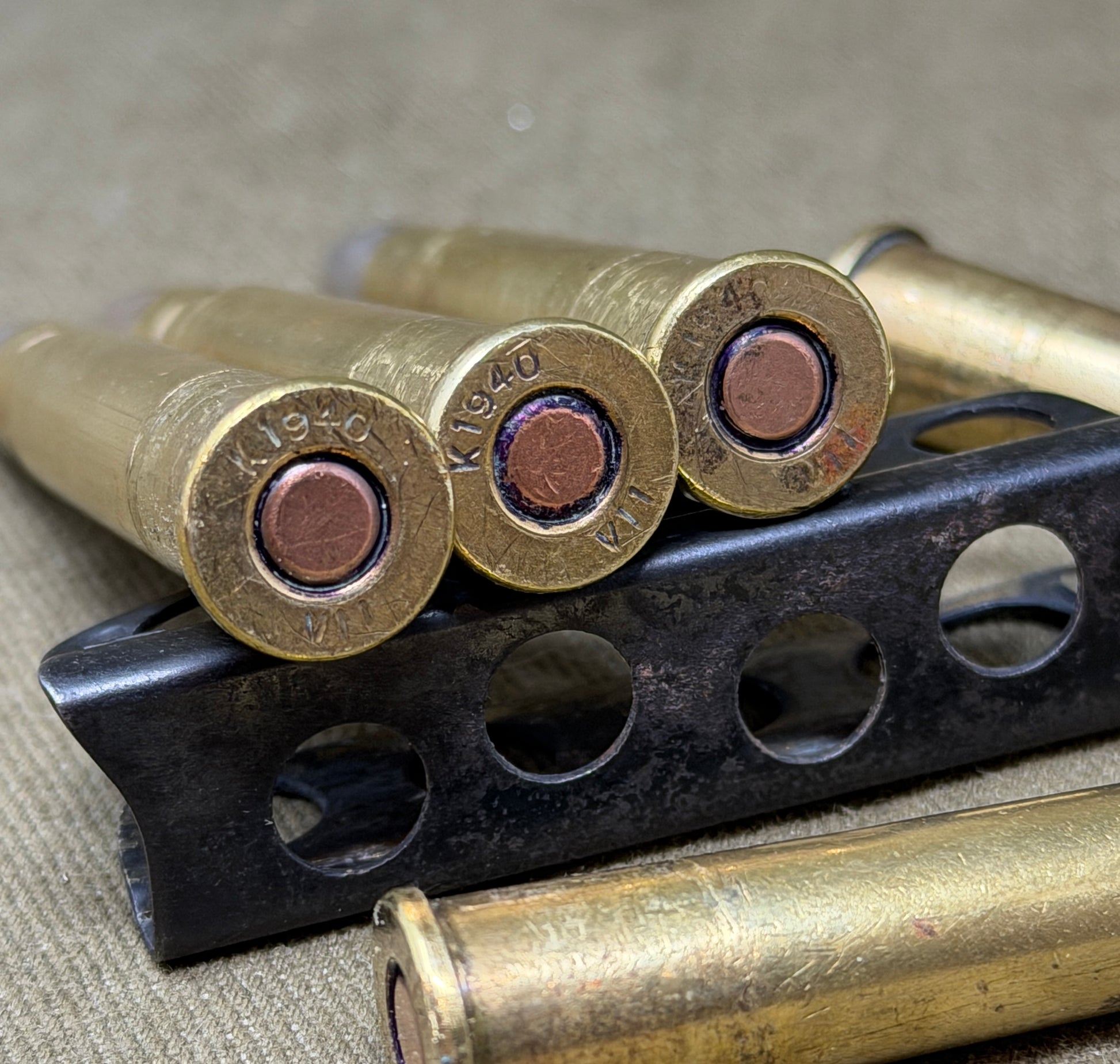 Each cartridge has been professionally rendered inert, with all powder removed and oil-injected primers ensuring complete safety while preserving the original appearance. The headstamps clearly show the “K” mark for Kynoch along with the wartime 1940 date, placing these rounds firmly within the early years of the Second World War when demand for ammunition was rapidly increasing.