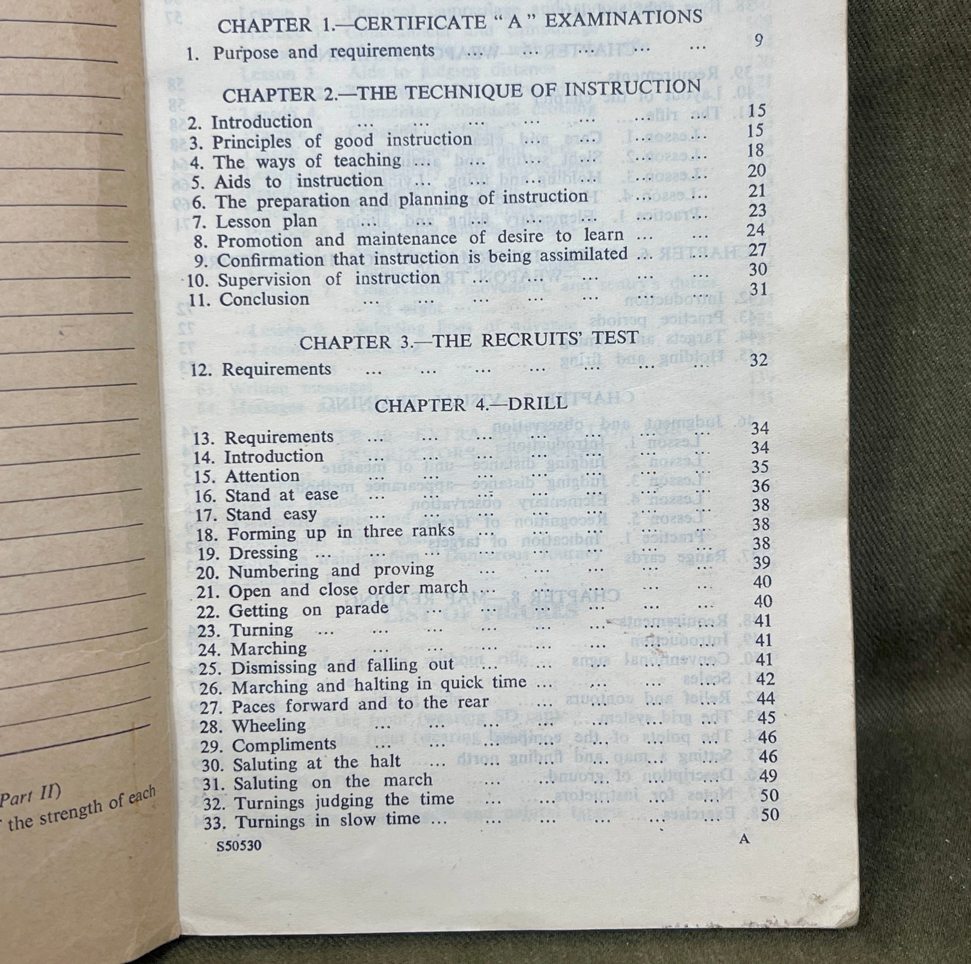 Printed in 1956, this edition reflects the transition of the British Army from wartime practices to the modern training standards of the Cold War era. It was intended to guide instructors and cadets in building core soldiering skills, emphasizing leadership, teamwork, and self-reliance. The booklet features clear instructional text, diagrams, and period illustrations typical of mid-century military publications.