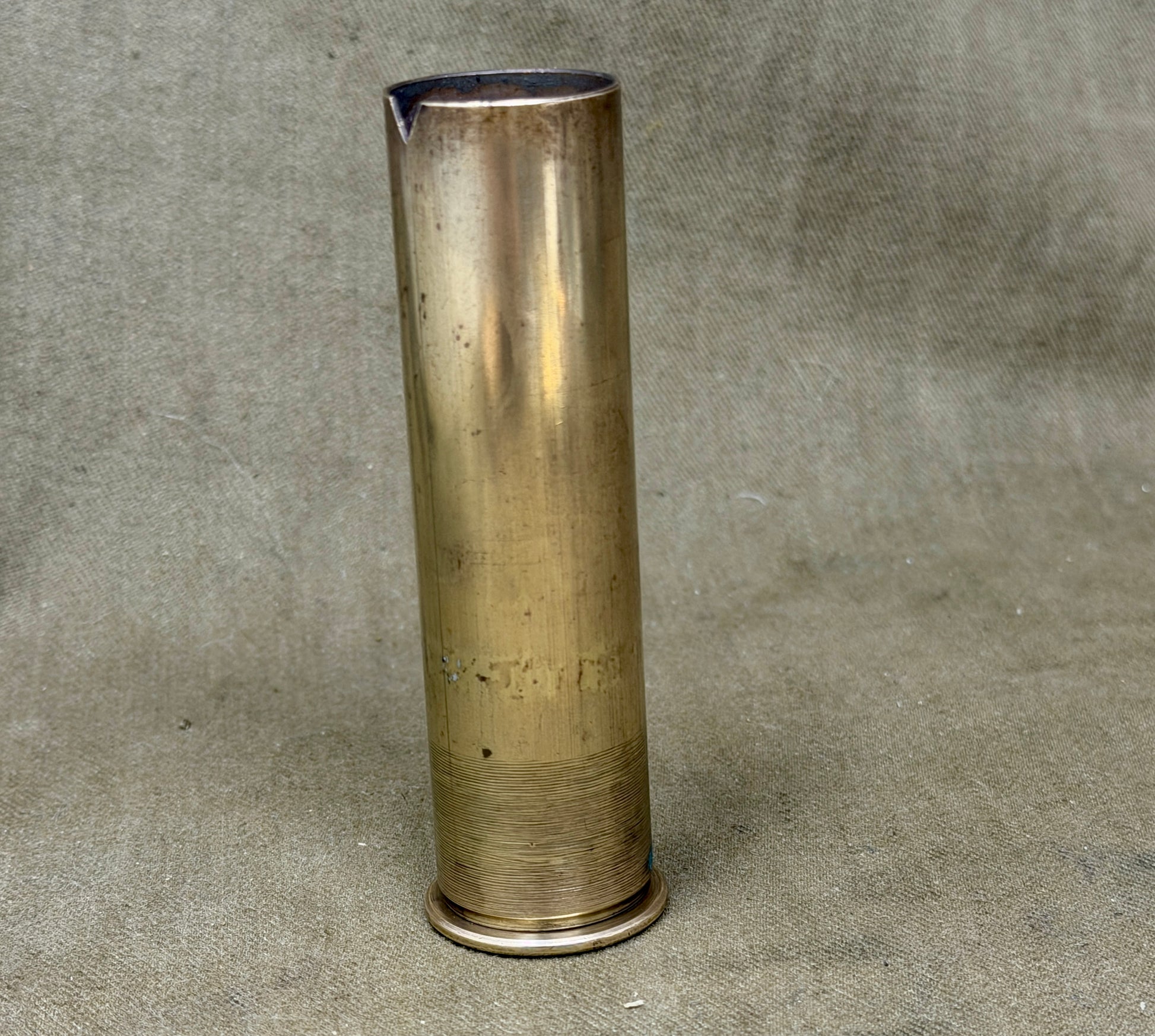 This is a Danish 20x120 mm Madsen brass cartridge case, manufactured for use with the Madsen 20 mm automatic cannon. The headstamp “HA” denotes production by the Danish Government Arsenal in Copenhagen (Hærens Arsenal), a key supplier of military munitions during the early to mid-20th century. The 20x120 mm round was widely used in anti-aircraft and naval roles, as well as on armoured vehicles. Constructed from solid brass, the cartridge case is large and impressive in display, with clearly struck headstamp markings. Inert examples are highly sought after by collectors of WW2 and interwar ordnance, particularly those specialising in Scandinavian military ammunition and artillery-related militaria.