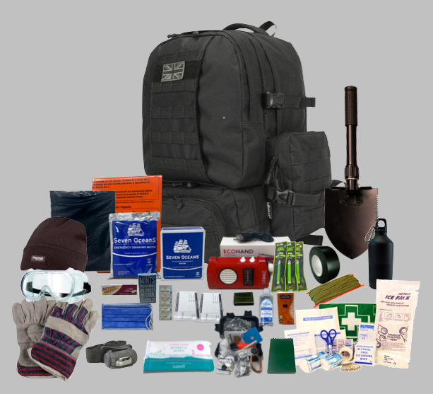 1 x 50L Black expedition rucksack 1 x Seven Oceans 72hr emergency food ration 1 x Seven Oceans 72hr emergency water ration 1 x Duronic wind up radio 1 x Reusable poncho 1 x Emergency survival bag 2 x Emergency silver foil blanket 1 x Compact shovel 1 x Thinsulate wool hat 1 x Pr leather rigger gloves 1 x LED head torch 1 x Pr indirect safety goggles 5 x Surgical masks 1 x Roll tape 1 x Waterproof notepad1 x Hand gel 1 x 15m Paracord 1 x Tin mints 1 x Packet of dextrose sweets 1 x Windproof matches 1 x Pack tissues 1 x 500ml water bottle 1 x 40 Piece first aid kit 3 x Snap lights 1 x Pack bath wipes 1 x Waterproof plastic case 1 x Whistle 1 x Fishing line and hooks 1 x Compact candle 1 x Snare 1 x Firestarter 1 x Wire saw 1 x Sewing kit 1 x Razor blade 1 x Survival mirror 1 x Pencil