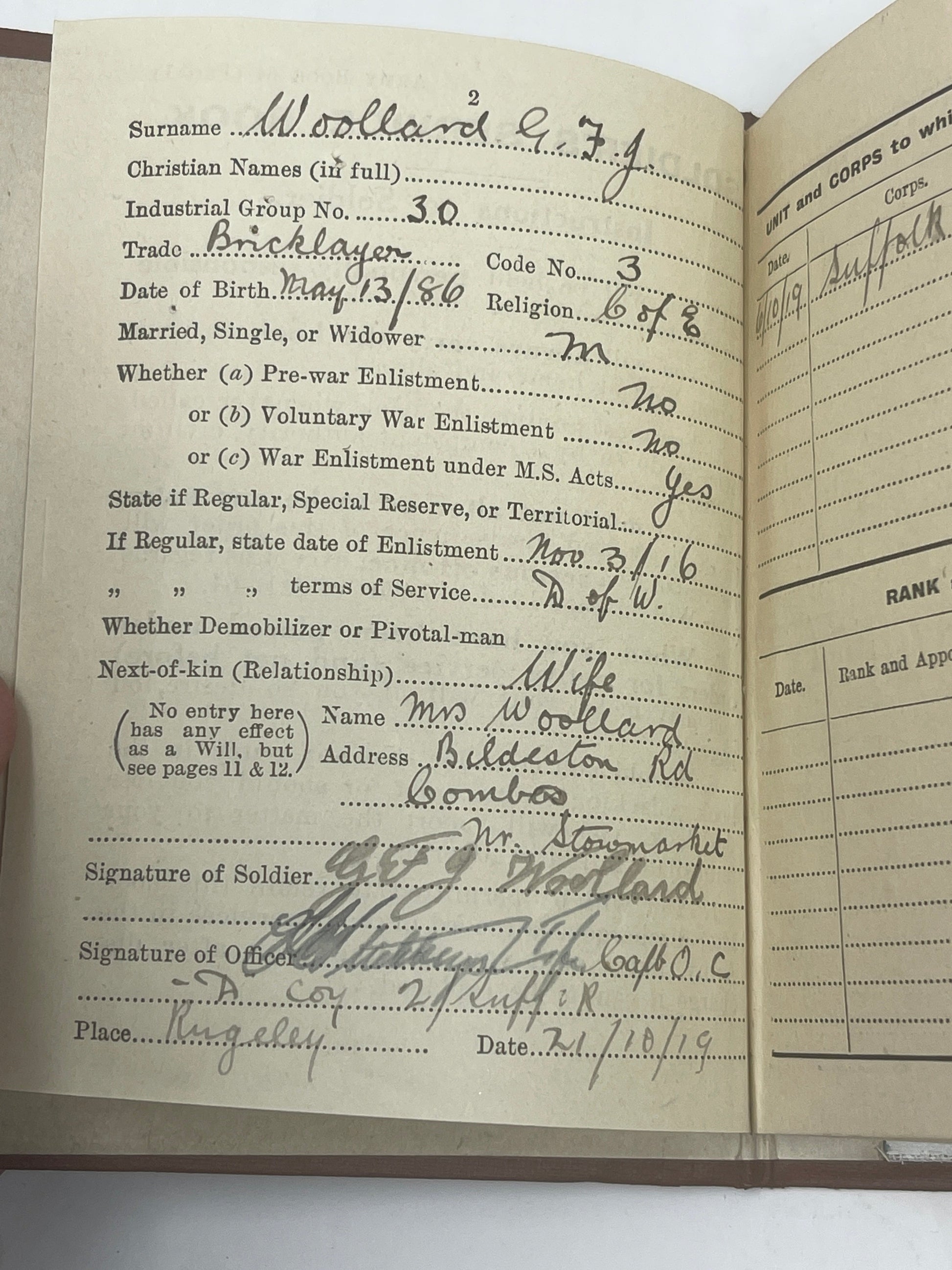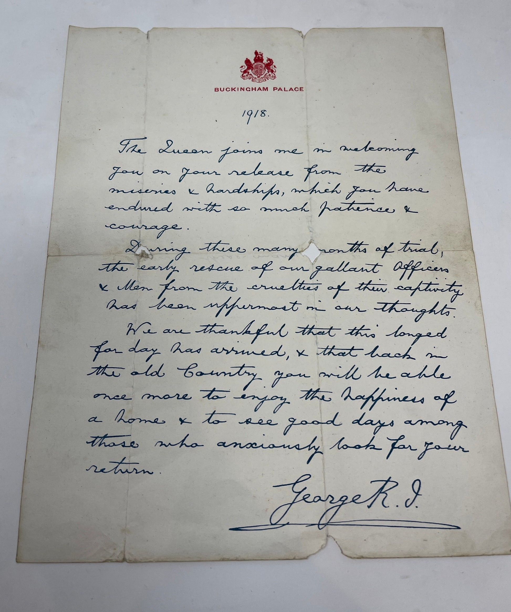 The Queen joins me in welcoming you on your release from the miseries + hardships, which you have endured with so much patience + courage./During these many months of trial, the early rescue of our gallant Officers + Men from the cruelties of their captivity has been uppermost in our thoughts. We are thankful that this longed-for day has arrived, + that back in the old Country you will be able once more to enjoy the happiness of a home + to see good days among those who anxiously look for your return./George RI'.