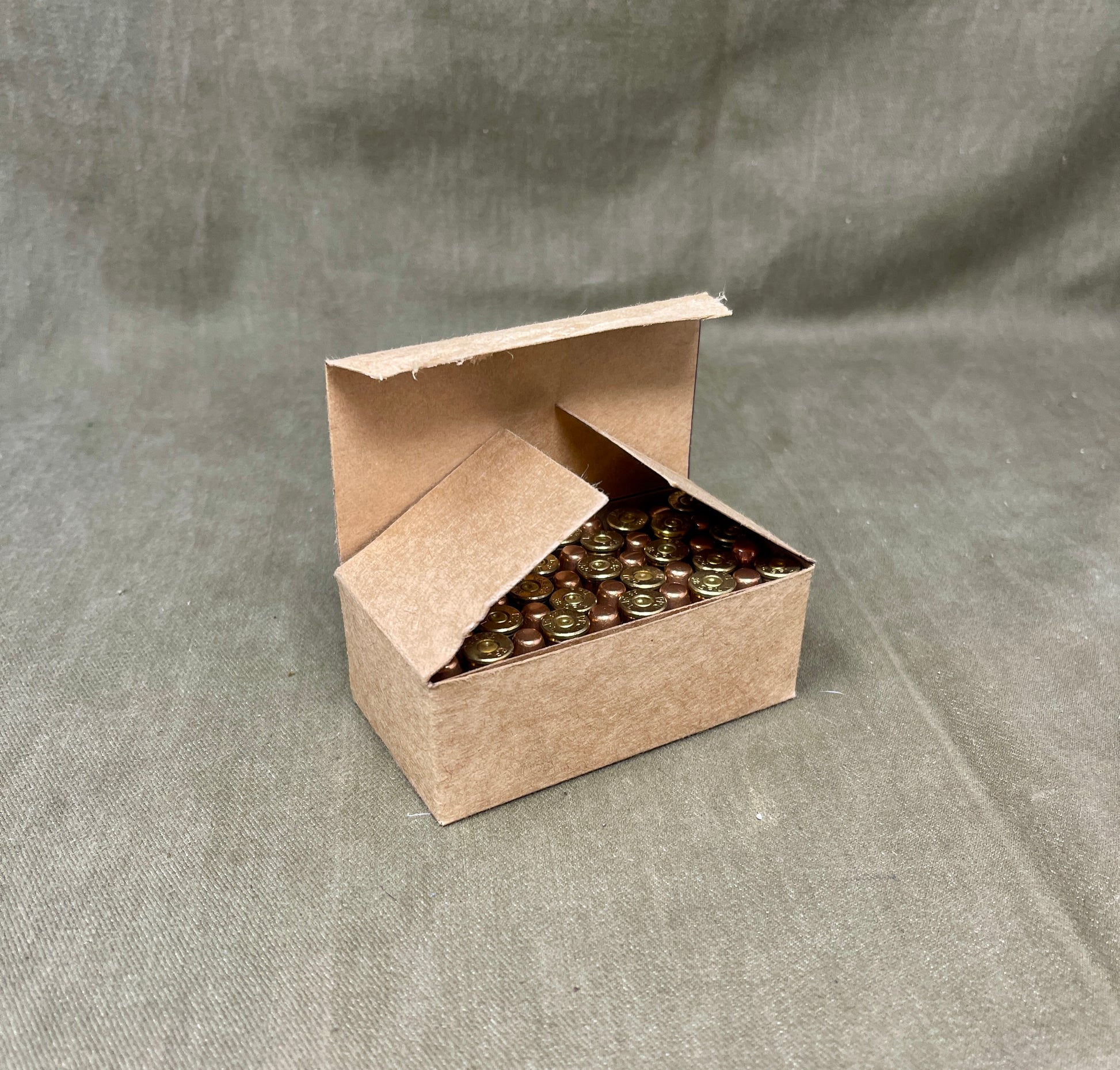 Reproduction Vietnam-era ammunition box containing fifty INERT .38 Special ball cartridges, presented as an accurate, display-ready kit for collectors, reenactors, and educational institutions. The exterior reproduces period printing and wear while the interior includes custom foam inserts to secure each cartridge during handling and transit. Every cartridge is certified inert: they contain no propellant, no explosive compound, and all primers have been fired or permanently deactivated to ensure safe, non-functional status.
