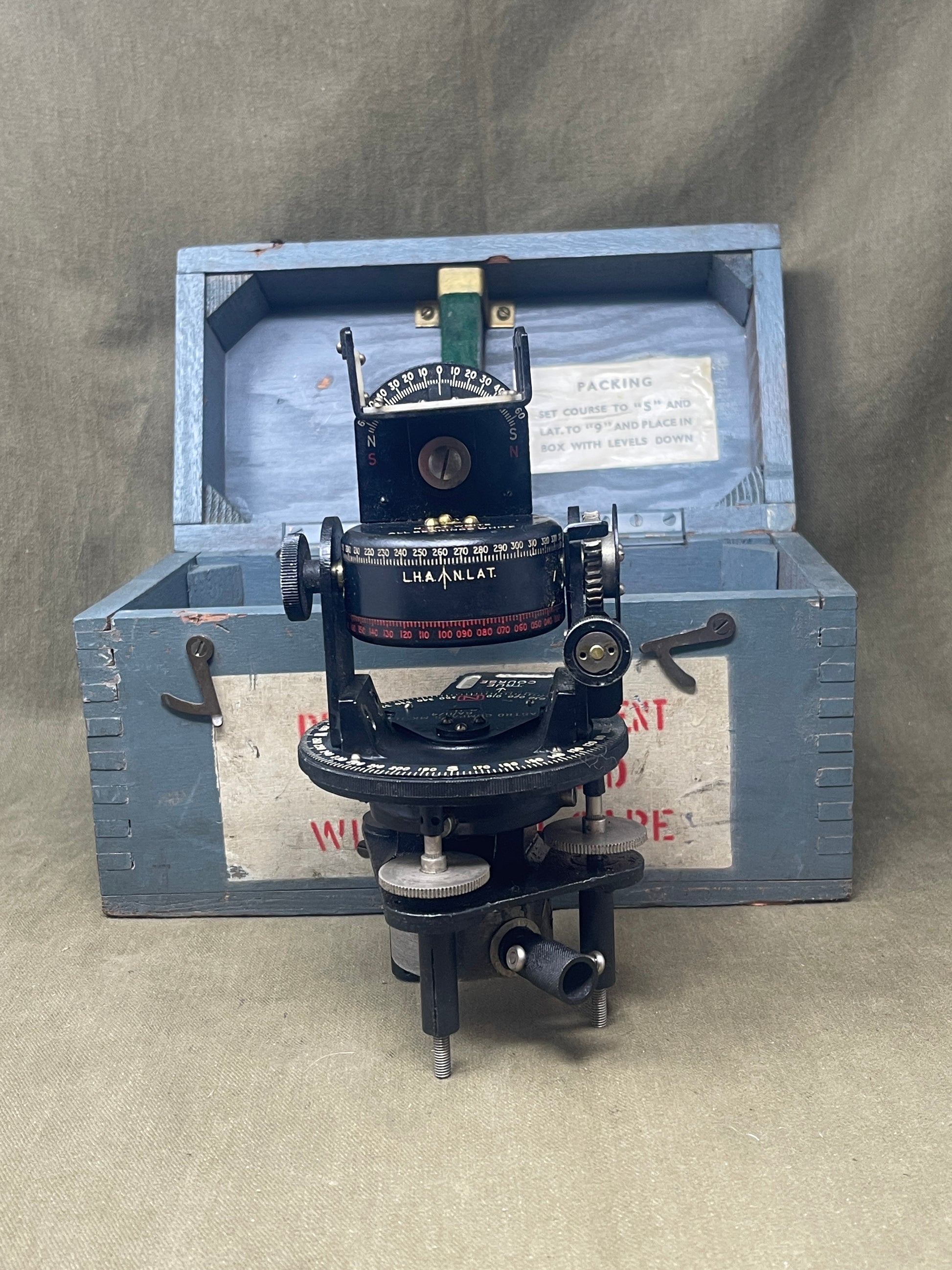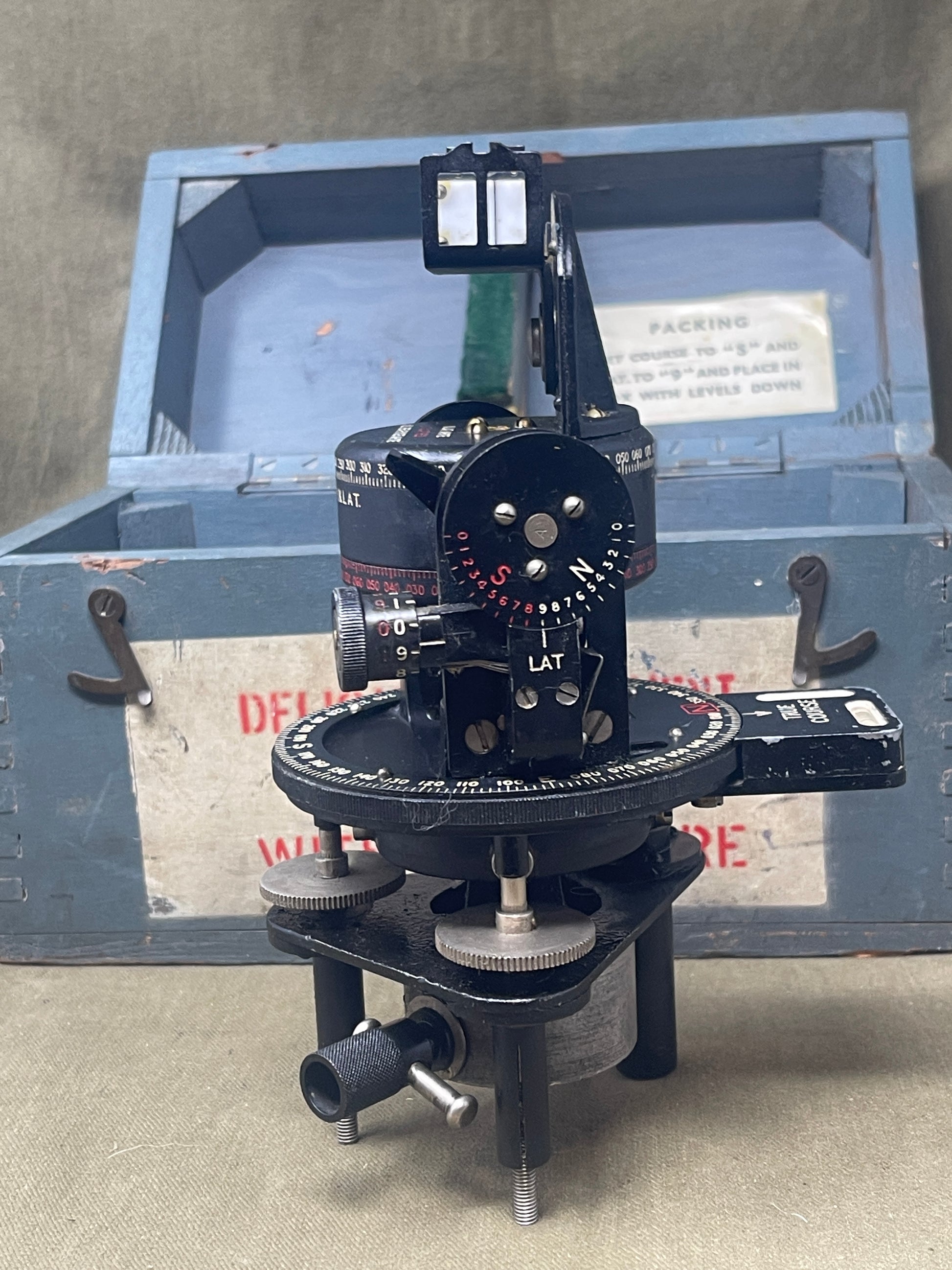The compass features a robust and well-engineered design, built to withstand the extreme environments of high-altitude flight. It includes a finely calibrated dial with clear markings for precise readings, housed within a durable metal casing. The craftsmanship reflects the high standards required for military aviation equipment during wartime. The presence of its original box adds to its historical and collectible value, preserving its authenticity and making it a standout piece for collectors, museums, or aviation enthusiasts.
