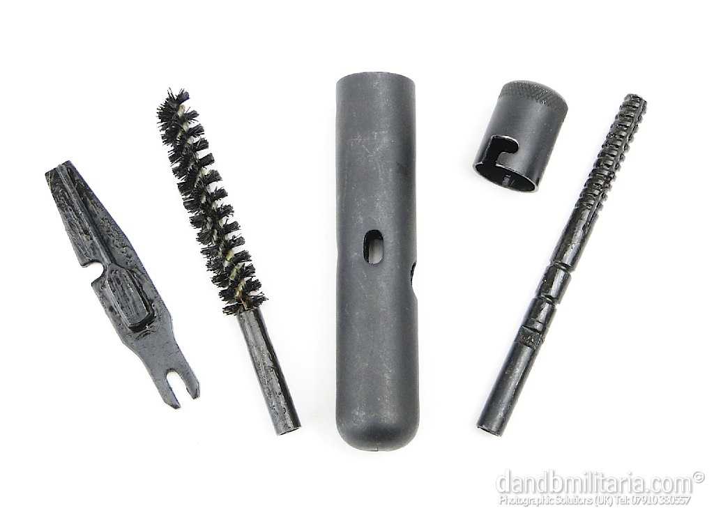 The kit typically includes a multi-purpose cleaning rod, bore brush, chamber brush, slotted patch holder, and oil bottle, all crafted from durable materials to withstand rigorous use in diverse conditions. These components are housed in a rugged metal tube or pouch that protects them from environmental elements such as dirt, moisture, and dust.