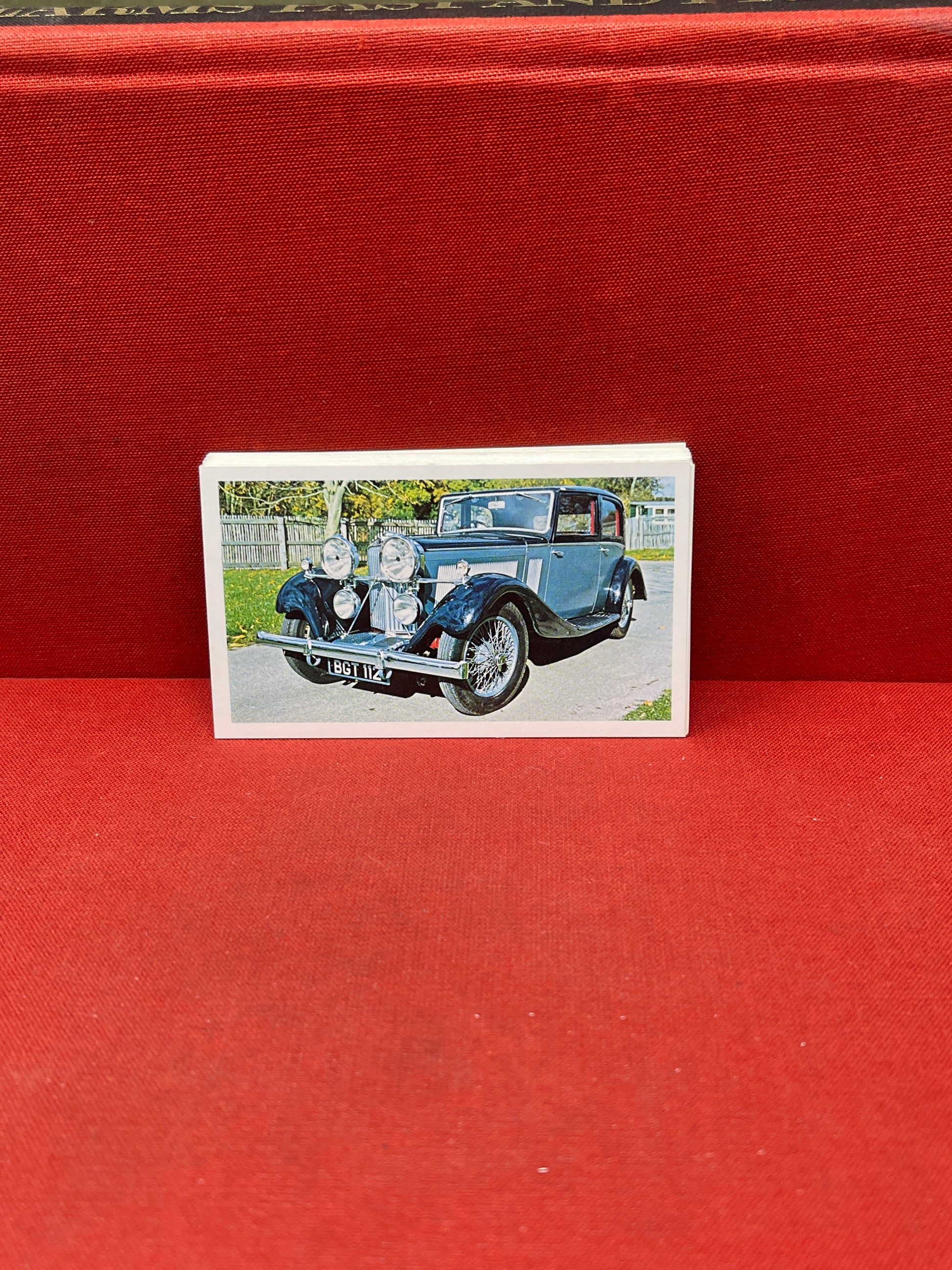 Description: This set was issued by Sharman Newspapers as one of a series of "Golden Age of" sets and contains colour photos of British-built cars from 1920 to 1939. The superb pictures and texts bring to life the achievements of these historic vehicles which include a 1920 Vauxhall E-Type, a 1922 Rover Eight, a two-seat Bentley tourer, the 1923 Austin Seven which is described as the 1920's equivalent of the Mini, a 1924 Sunbeam, the unconventional Trojan PB of 1924, the Morris Cowley named after William Morris who was described as the Henry Ford of the British motor industry, a 1925 Rolls-Royce Phantom 1 formerly owned by the second Lord Montagu of Beaulieu, a 1930 M.G. Midget, the 1933 Aston Martin 1 ½ litre used at Le Mans, a Morgan Super Sports three-wheeler, the quiet running Talbot 105, a 1935 Austin Ten Lichfield, the 1937 Wolseley 25hp given by the workers to Lord Nuffield and the sleek Lagonda V-12 from 1939. Interestingly the bottom of the card gives details of the price, top speed and fuel consumption of the cars.
