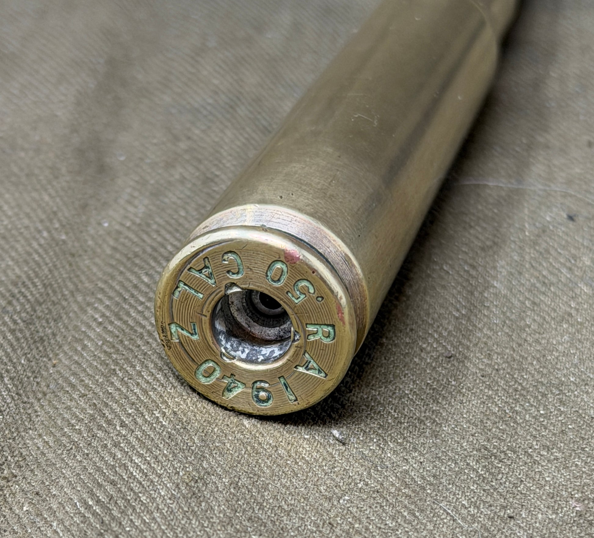 This original .50 calibre (12.7×99mm) inert round features a “50 CAL Z RA 1940” headstamp, identifying it as a genuine early World War Two production example manufactured at the Royal Arsenal, Woolwich, London. Dated 1940, this round represents one of the earlier British-produced .50 calibre cartridges from the opening stages of the war.