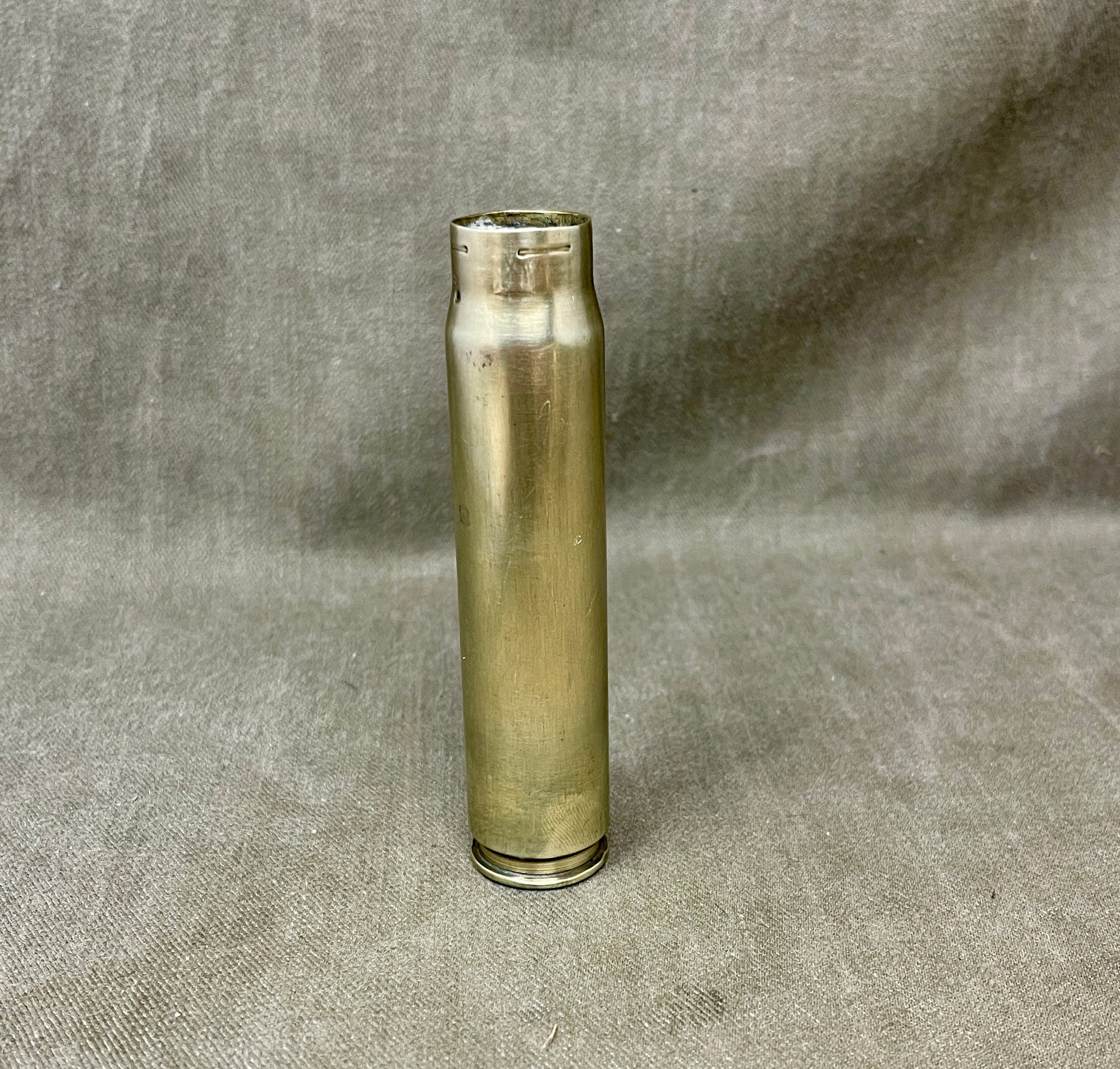 These brass shell cases would have originally been used with the 20mm Hispano or Oerlikon cannon—both widely employed across British fighter aircraft and naval mounts during the war. Each case bears the authentic patina and wear consistent with age and service use, offering a genuine connection to Britain’s WWII military and industrial history. The clear headstamps make them ideal for collectors who value readable, well-preserved markings.