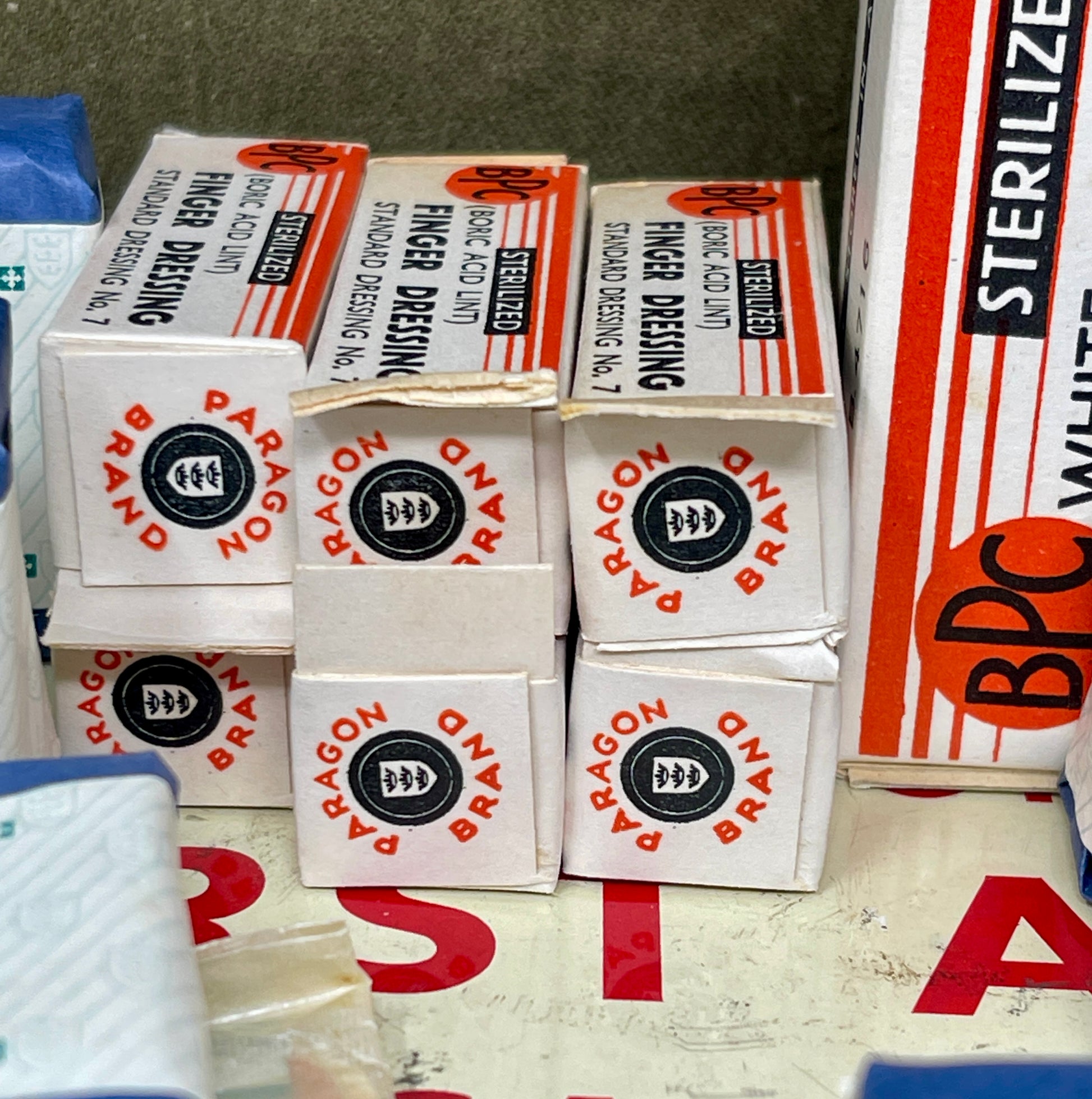 The kit is housed in its original metal case, finished in a durable paint to resist wear and corrosion. The lid is clearly marked with the Paragon First Aid label, a distinctive feature that makes these kits instantly recognisable. Inside, the full complement of medical supplies remains intact and neatly arranged, including bandages, dressings, antiseptic treatments, safety pins, and other vital items. Each component has been carefully preserved, making this a rare example that retains its authenticity and completeness.